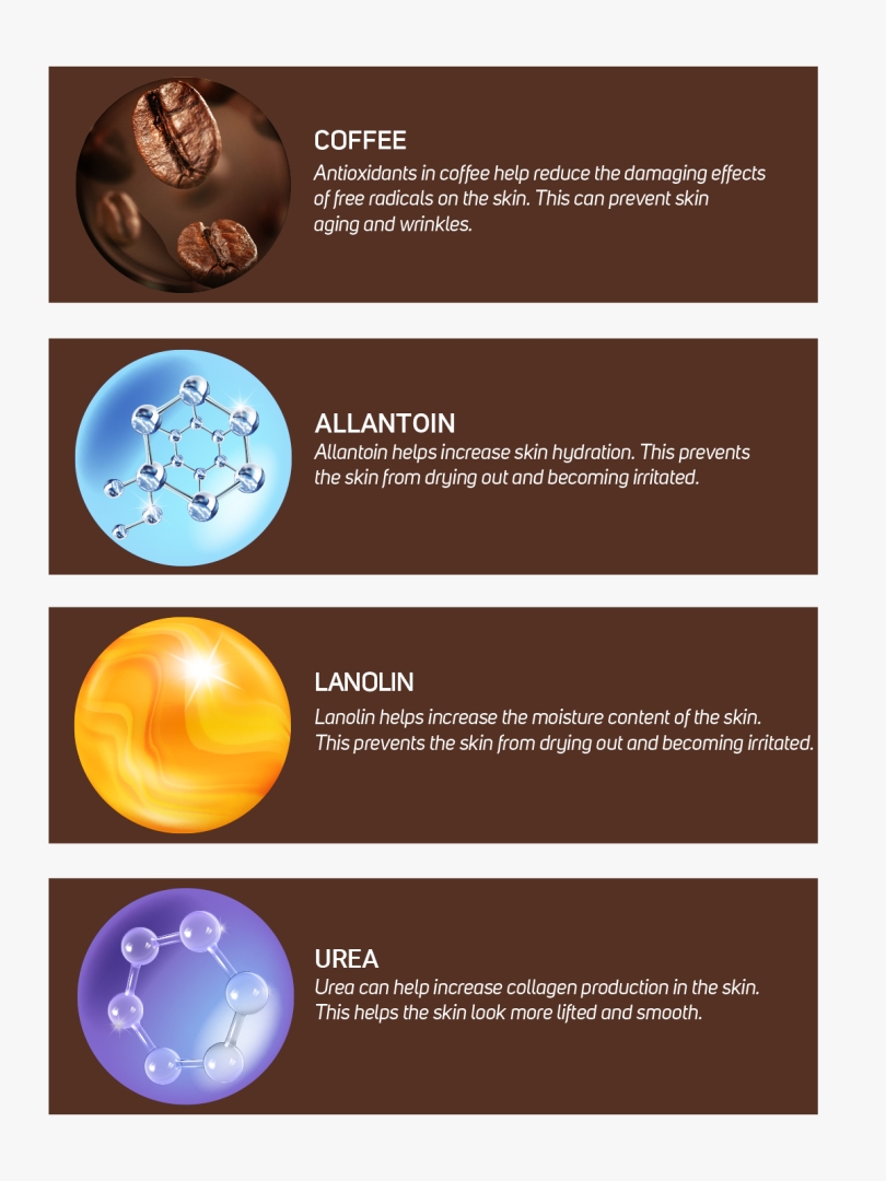 INGREDIGENTS: Aqua, Paraffinum Liquidum, Cetearyl Alcohol, Urea, Glyceryl Stearate, Ceteareth-20, Glycerin, Lanolin, Dimethicone, Sodium Lactate, Panthenol, Coffea Arabica Seed Powder, Phenoxyethanol, Parfum, Allantoin, Zea Mays Germ Oil, Ethylhexylglycerin, Caprylic/Capric Triglyceride, Triticum Vulgare Germ Oil, Chamomilla Recutita Flower Extract, Calendula Officinalis Flower Extract, Caffeine, Simmondsia Chinensis Seed Extract, Macadamia Ternifolia Seed Oil, Triethanolamine, Tocopherol, Panthenyl Triacetate.